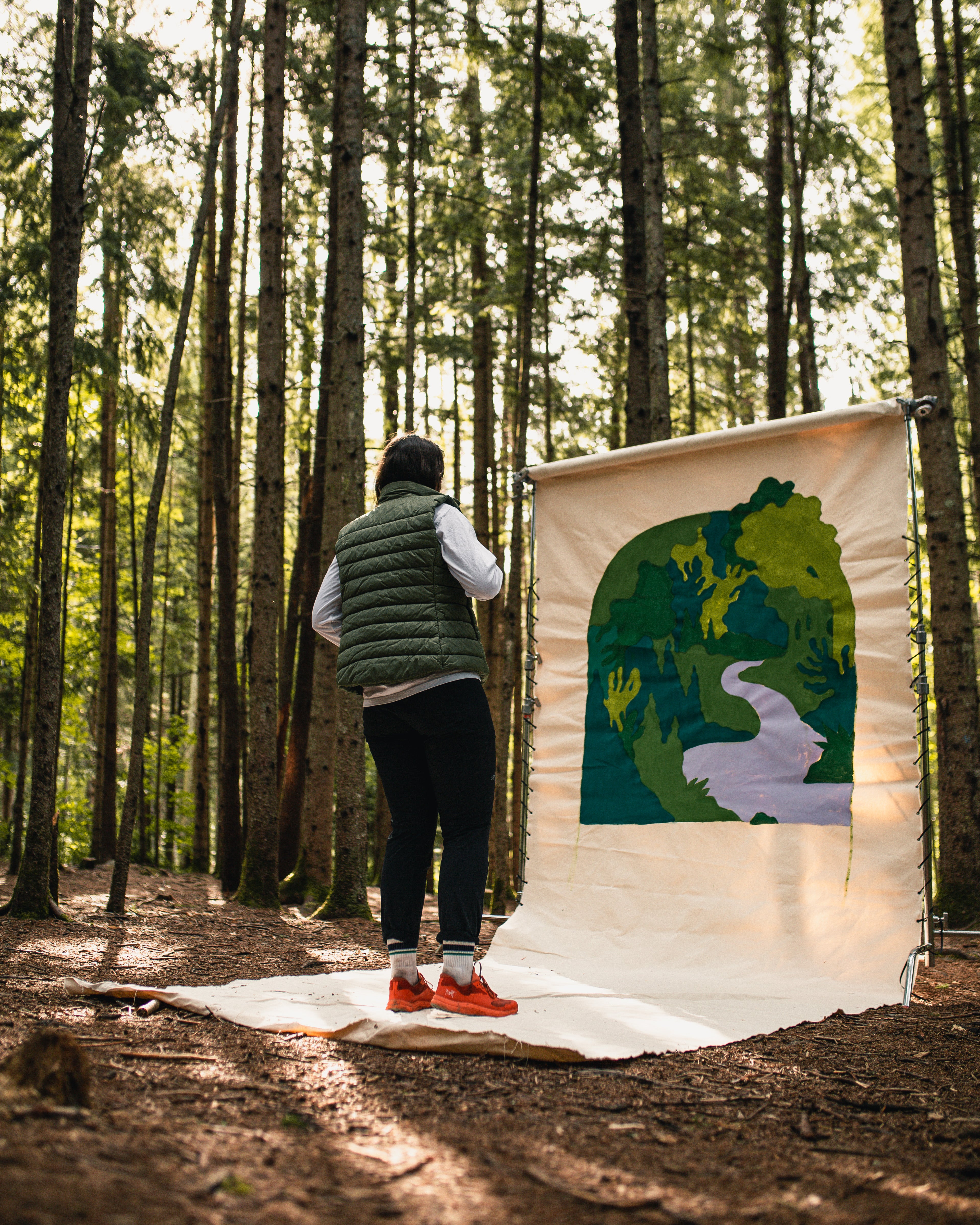 « Pour moi, il y a une énorme différence entre peindre à partir d'une photo, et d'être sur les lieux de ce que je souhaite peindre. La raison est simple : toute l'expérience sensorielle que je vais vivre va contribuer à mon oeuvre. "Est-ce qu'il faisait chaud cette journée-là? Est-ce que c'était frais?" Ces éléments vont avoir un impact sur la palette de couleur que je vais utiliser par exemple. Être sur les lieux me permet également de garder ce que je souhaite garder. Si je peins à partir d'une photo, je ne peux pas savoir ce qu'il y a derrière la souche X qui me plait moins. Bref, un paysage, ça peut facilement être plate, être quétaine... mais si on est sur place, on est plus capable de rendre ailleurs ce qu'on a vu... ce qu'on a vécu.»